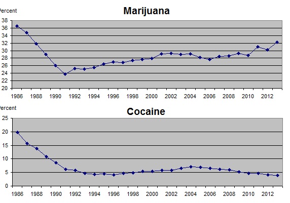 Trends in Annual Prevalence of Marijuana and Cocaine, Ages 19-28