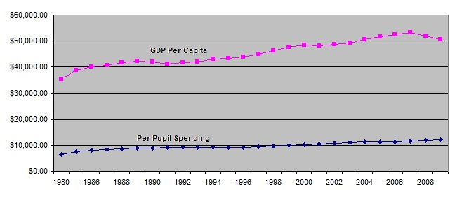 Comparison of Spending Per Pupil and GDP Per Capita 1980-2009 in 2014 Dollars