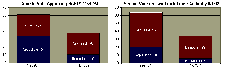 There is a split within each of the main political parties on free trade. Traditional Democrats, guided in part by the interests of organized labor, tend to oppose free trade as a threat to the interests of domestic workers. "New Democrats" believe that trade encourages economic growth thus rewarding ordinary Americans with increased goods and services and better employment opportunities. Former President Clinton, together with past Presidential candidates Gore and Kerry, supported free trade. Spurred by agricultural interests and multinational corporations, the majority of Republicans also support free trade but there remains a distinct minority who resist the globalism of the American economy as a threat to national autonomy. The divide within each party is illustrated in Senate votes on NAFTA and on "fast track" trade authority.