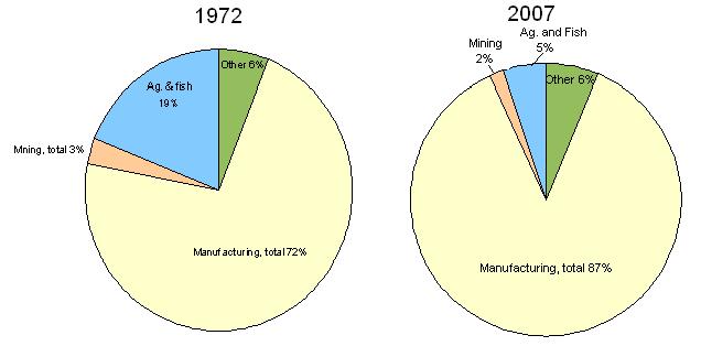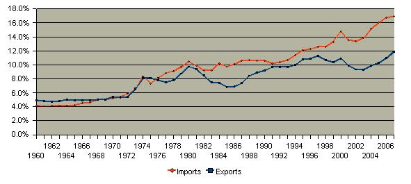 During the past three decades, the increase in world trade has outpaced overall economic growth. (Click to see chart) . This is true in the U.S. was well. Exports now account for over 10% of U.S. economic activity and imports are well above 15%. A substantial portion of international trade occurs between the member countries of the European Union. If only the European Union's external trade is considered, Europe and the U.S. combine for over 40% of world imports and 30% of world exports. All these countries have very low tariff rates . Manufacturing has been responsible for both the increase in exports and imports .