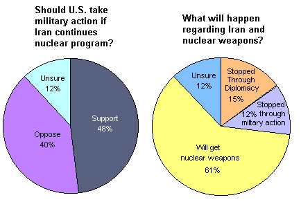 As far as the American public is concerned, it is clear that the attitude toward Iran is still colored by the hostage crisis. A majority believes that Iran will successfully develop nuclear weapons and almost half would support military intervention to halt Iranian nuclear activities. (Click to see chart) But in comparison to Iraq, there appears to be far less justification for military intervention. There has been no finding that Iran is in violation of its treaty agreements. Iran has no history of using weapons of mass destruction. On the contrary, they were victims of Saddam Hussein's use of chemical weaponry. While intensely religious and nationalistic, its governmental processes allow for public participation. It is arguably more stable and less a harbor for terrorists than Pakistan, a country that refused to agree to the Nuclear Non Proliferation Treaty and which has developed a nuclear weapons program. The nuclear program in Iran is probably best compared to similar undertakings in Brazil. The difference is that the US trusts Brazilian declarations of peaceful intent but does not trust similar Iranian declarations.